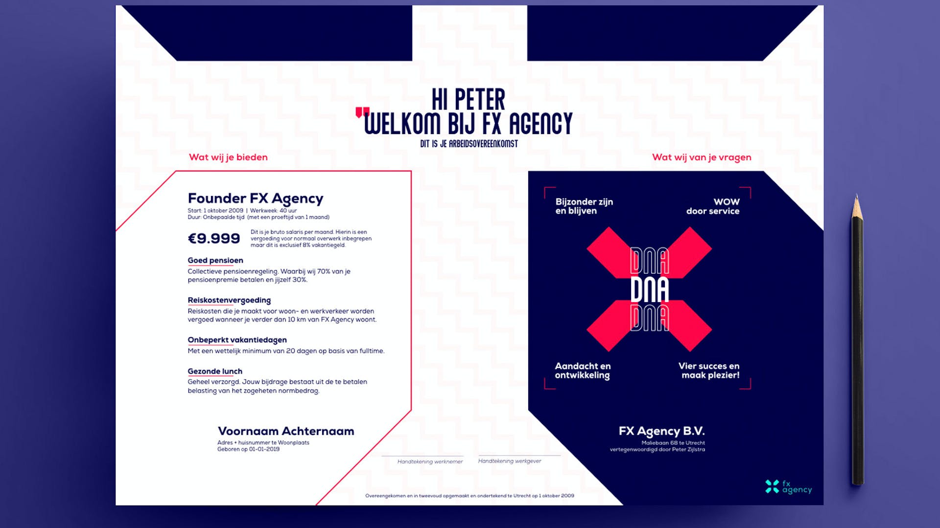 Het ondertekenen van een arbeidsovereenkomst is een moment waarop je vooruit kijkt naar al het moois dat je gaat maken en beleven. Je voelt de trots om onderdeel te zijn van dit team, met deze projecten. En het document om dat allemaal mee te vieren bestaat meestal uit louter juridische taal. “Pas op! Als het mis gaat doen we dit.” en “Let op! Er is Nederlands recht van toepassing”. Is dat niet een beetje gek? Bij FX vonden ze dat wel. En dus hebben ze hun arbeidsovereenkomst aangepast.